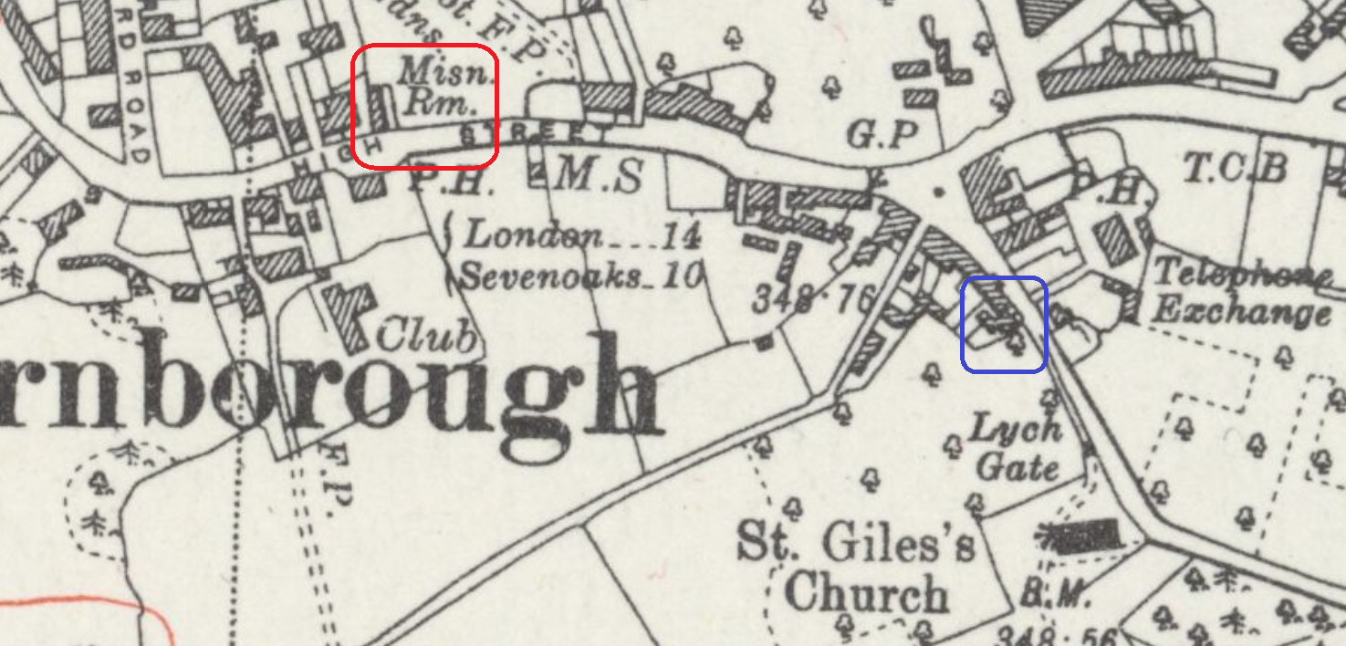 By 1934 it was recognised that the hall's condition was 'worn out' and thoughts turned to a new building. In 1936 planning permission was sought for a new 'temporary' building in Church Road but this was refused by Orpington Urban District Council. The location was where the public conveniences were to be built in 1946/47, the cottage on that site, which had been one of Farnborough's Dame Schools being in a dilapidated state. The term temporary, most probably refers to pre-fabricated building rather than one of brick.. Although the public conveniences have long gone, to be replaced by a new private dwelling at the same location, the site is also still home to the St. Giles Centre alongside.This OS 6 inch map from 1938 shows both the original location for the Gospel Hall, in red, and the proposed site in Church Road in blue. click to enlarge