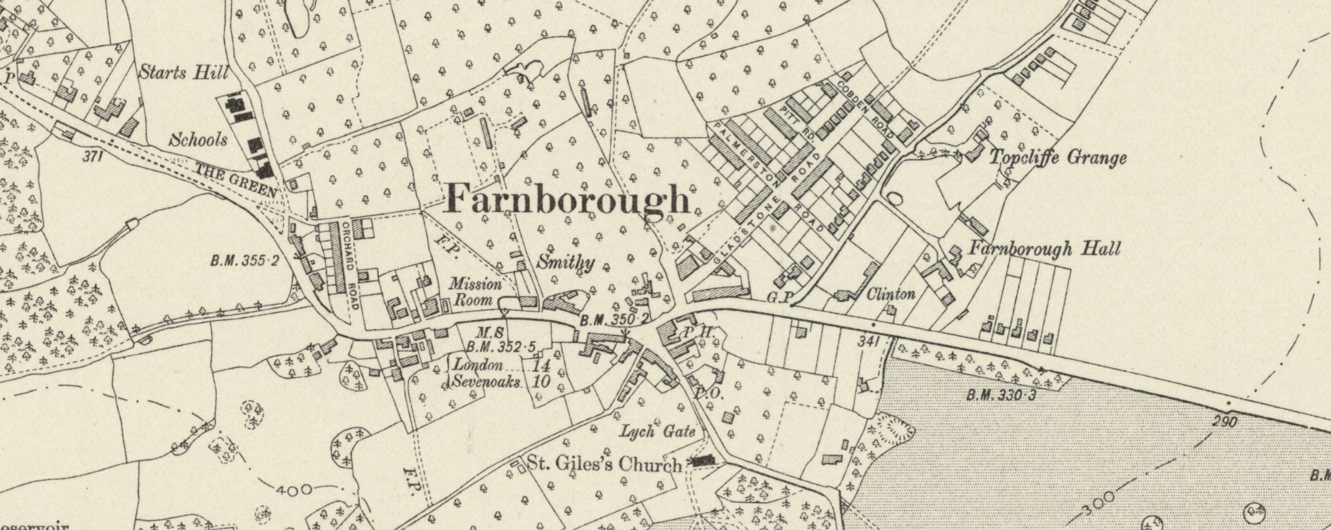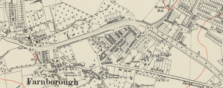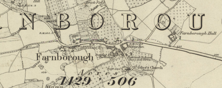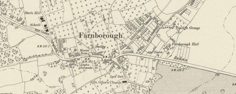 FARNBOROUGH, now in Greater London but formerly in Kent, should be distinguished from the better known Farnborough in Hampshire and from places of the same name in Berkshire and Warwickshire. It is a village on the high road to Sevenoaks, Tonbridge and Hastings, 14 miles from London, and about 350 feet above sea level.