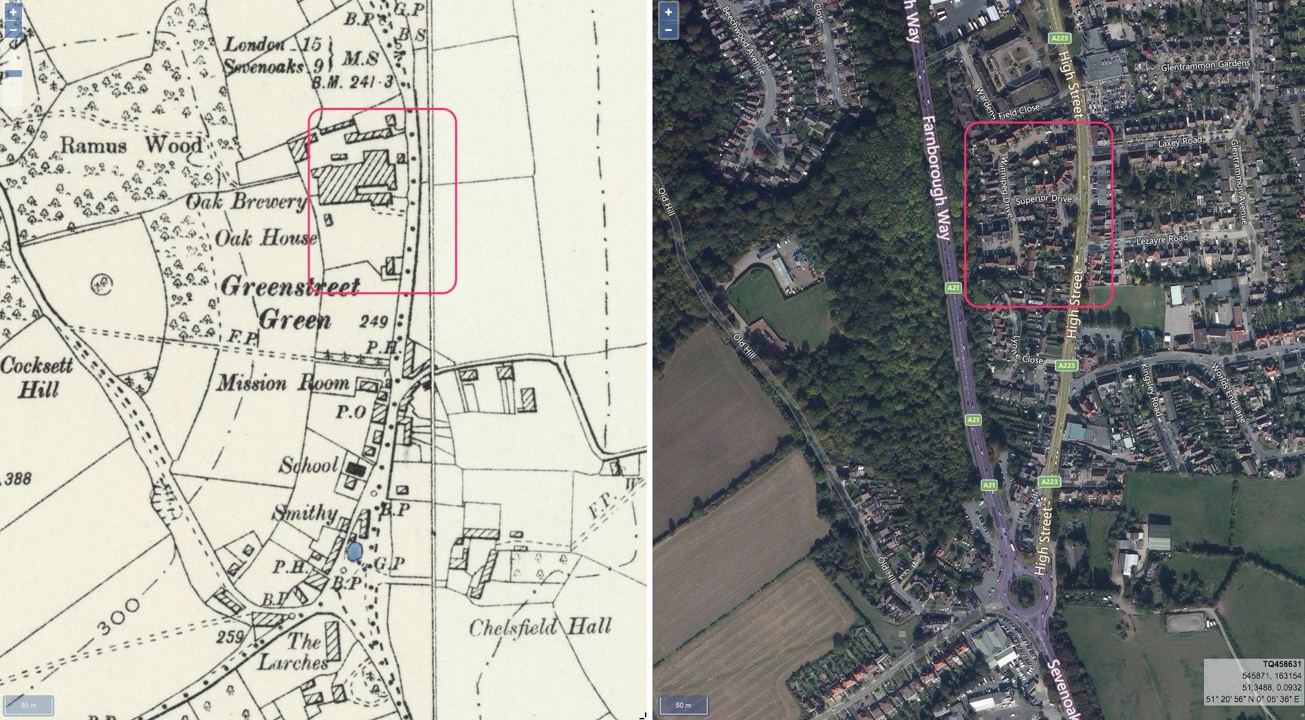 The maps below identify the site using a map from toward the end of the nineteenth century, contrasted with the current view.