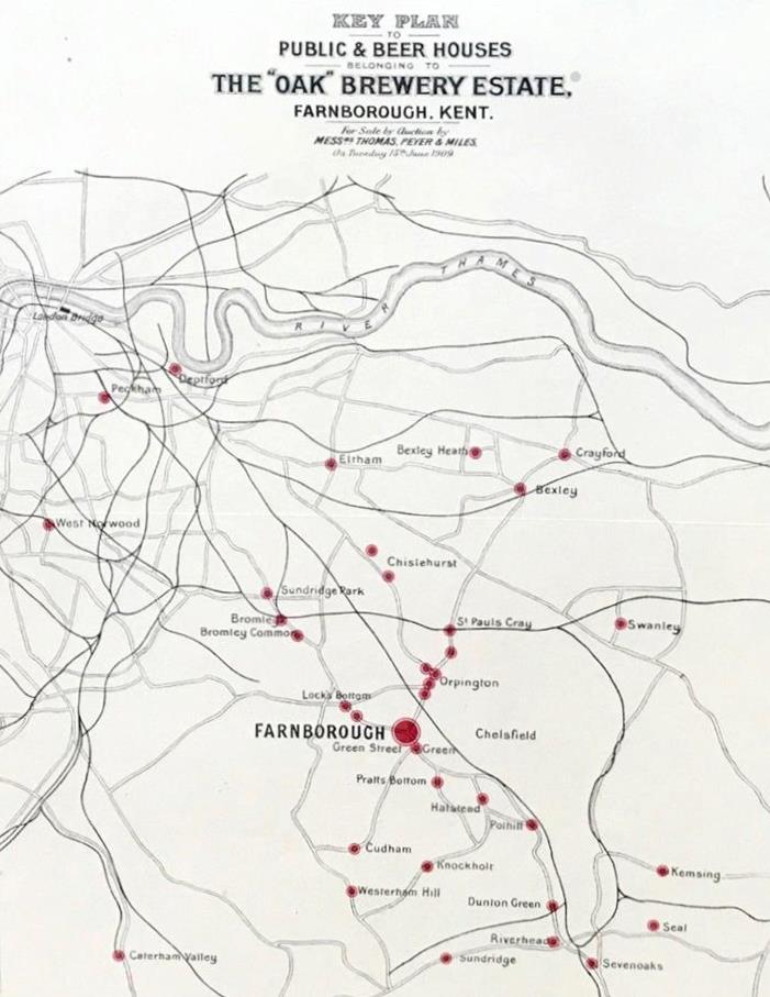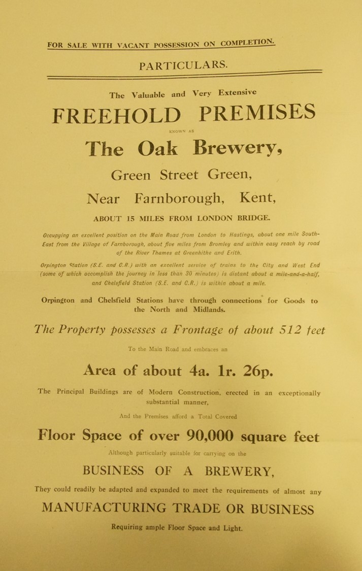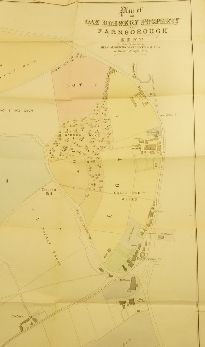 The sale included 25 acres of land in Green Street Green and elsewhere, comprising the brewery (including the offices and gas works) a farm , houses and stabling, plus sundry other land and cottages offered leasehold. This is the plan included with the aucrtion papers, it is dated 15th June 1909.