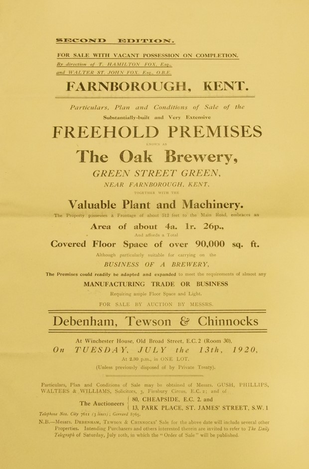 After Thomas Fox died, his sons took over the business, but made precious little effort to repay the loan; in fact they borrowed a further £14,250 in 1891 and £4,000 in 1894. By 1906 they owed a total of £37,000 plus interest and a further £9,020 to their solicitor, both personally and professionally. Their only collateral for these loans was the company, which would have to be sold.Sale of the site with Vacant Possession