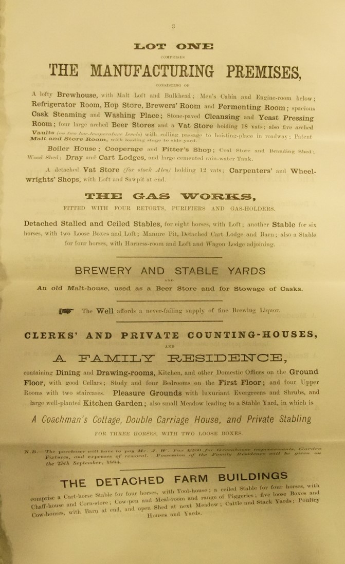 The company, by now consisting of the brewery, 29 public and beer houses as listed below, together with sundry other premises, was put up for auction in 1884. See panel to the right for more information about beerhouses.