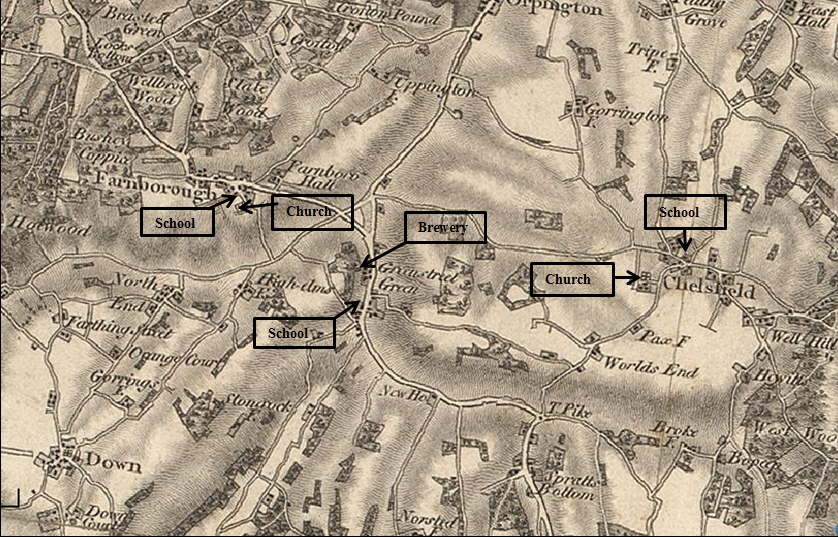 Before compulsory education, many children did not attend school, but worked providing essential income for poor households. Sunday schools provided the only training in reading and sometimes writing for many of these working-class children, probably including those in Green Street Green before the elementary school opened in 1851.Farnborough and Chelsfield had schools by 1836. Concern for social order among the young on Sundays encouraged the middle-classes to support schools as ‘key agencies in the inculcation of orderliness, punctuality, sobriety, cleanliness and related virtues governing personal behaviour and social discipline’, also important attributes among workers.