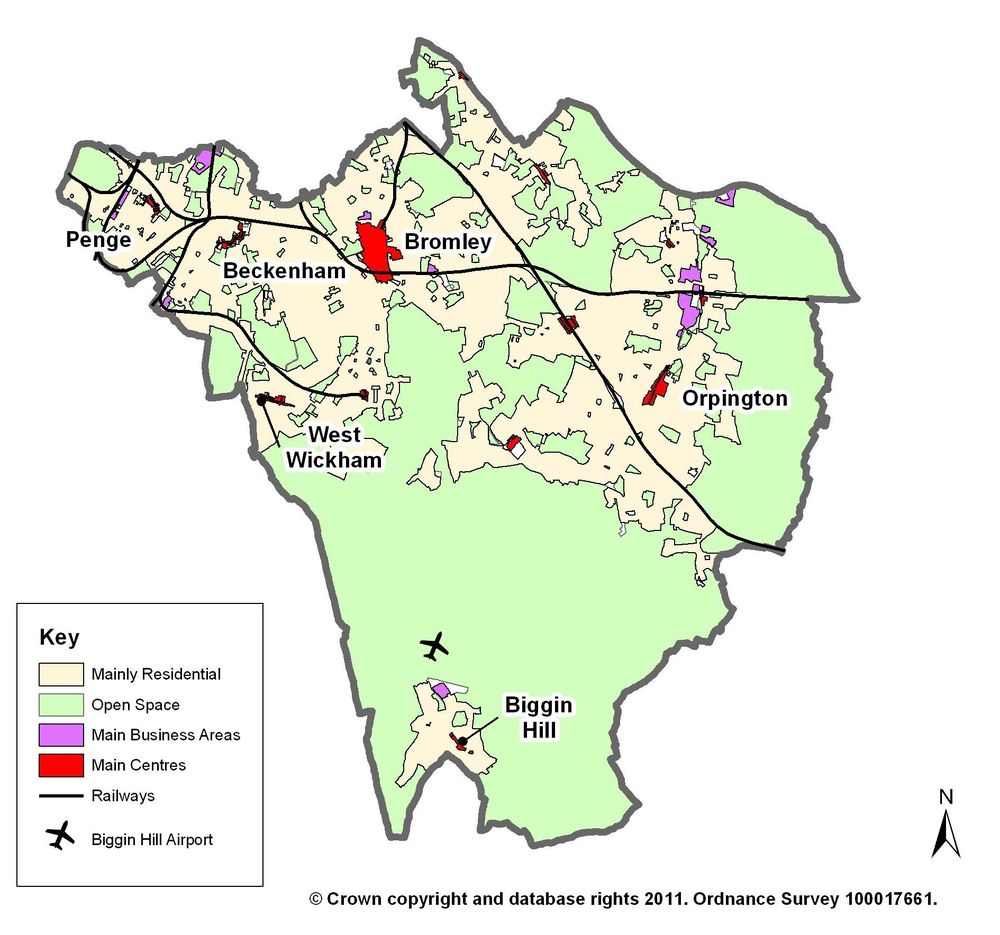 But nevertheless 'London or Kent' is not an unreasonable question. This is a modern map of the Borough of Bromley, and it can be seen that even if the rural half of the borough to the south within the 'Green Belt' is excluded, Bromley still has a lot of green space, more than any other London Borough in fact. And this is despite the significant new house building that occured after the war, particularly around Orpington.