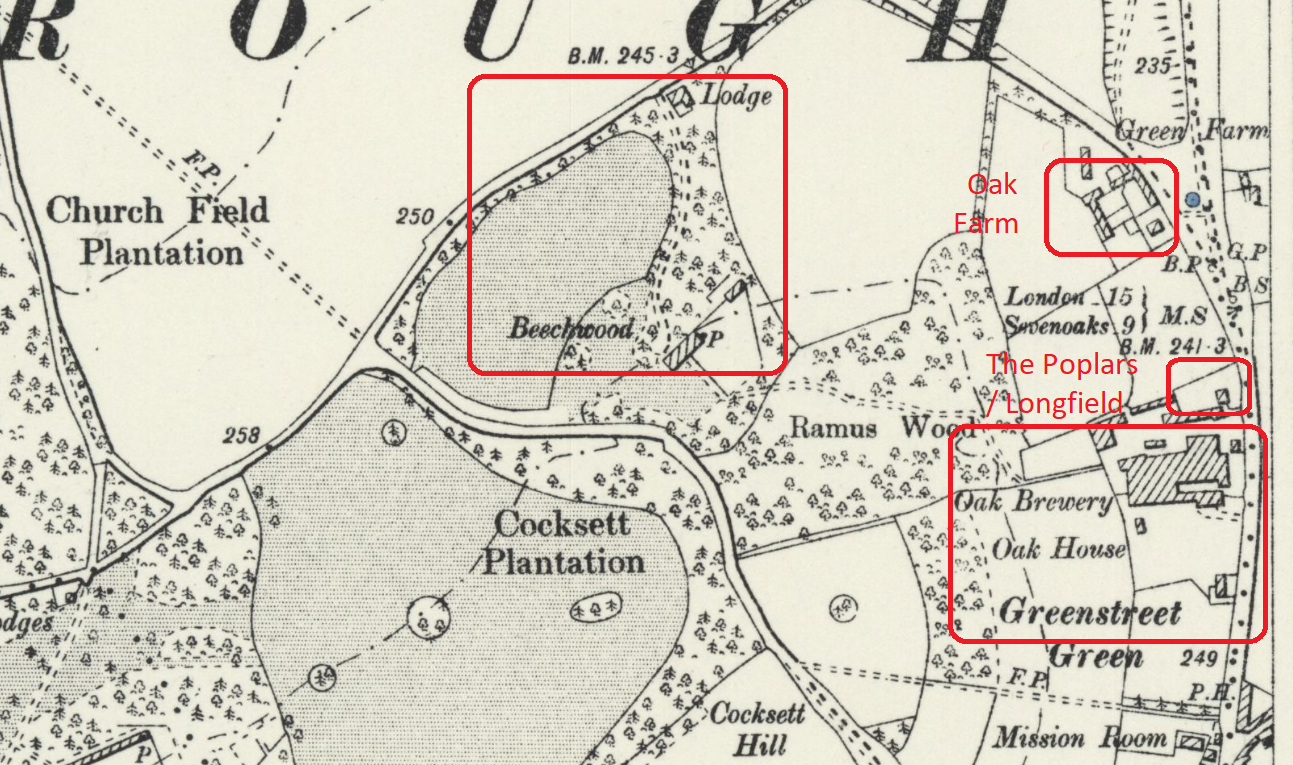 Beechwood, the Fox family home, is long gone, believed to have been demolished around 1939 or 1940. The Beechwood housing estate (Beechwood Avenue, Cleave Avenue, Cocksett Avenue, Ramus Wood Avenue and Kent Close) was built by Coleman Construction in 1935 just across Farnborough Way from the bus garage on part of the grounds that once surrounded the old house.