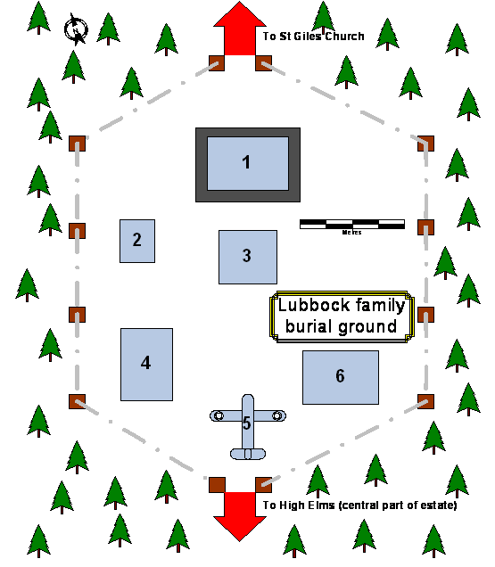The shape of the burial ground was hexagonal as shown in the photo, and the below diagram. Surrounding it was a chain link fence with 12 white wooden posts. At the north and south end were two wrought iron gates. A path led to the graveyard from the field just south of St Giles and another led from it going down towards the gatehouse lodge in Shire Lane.