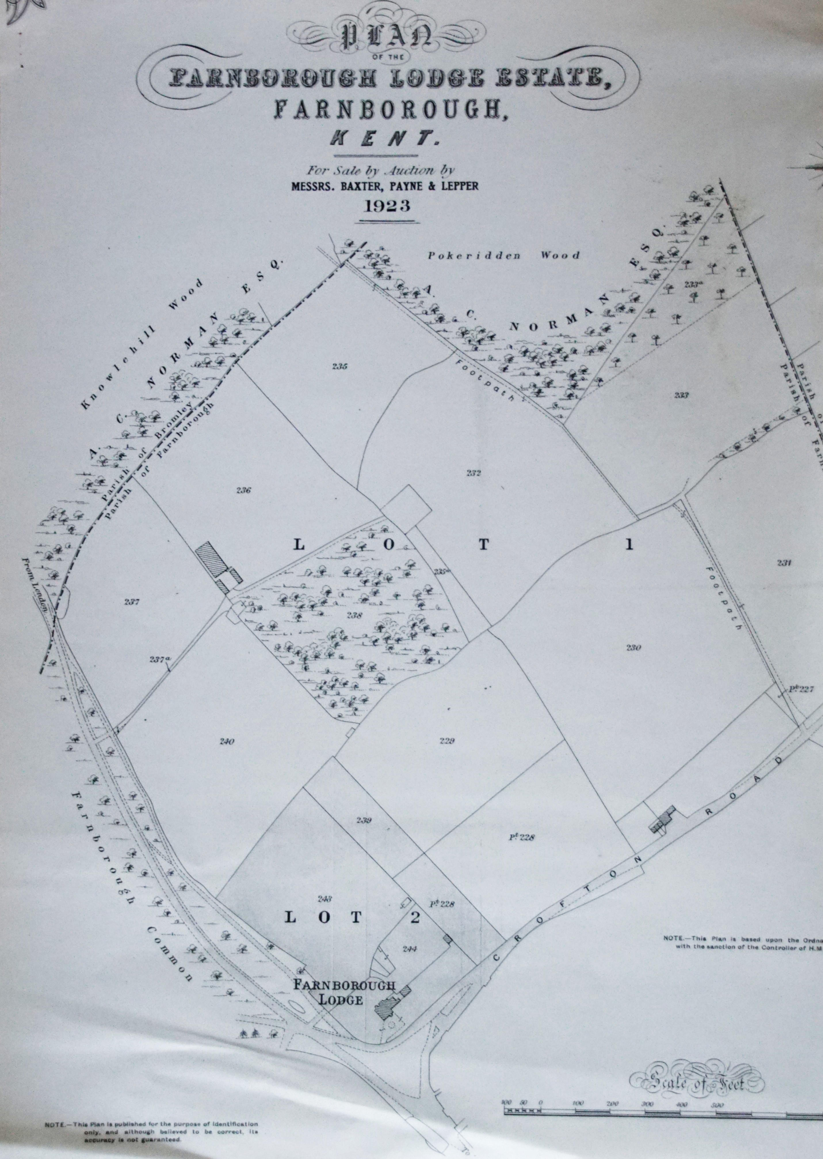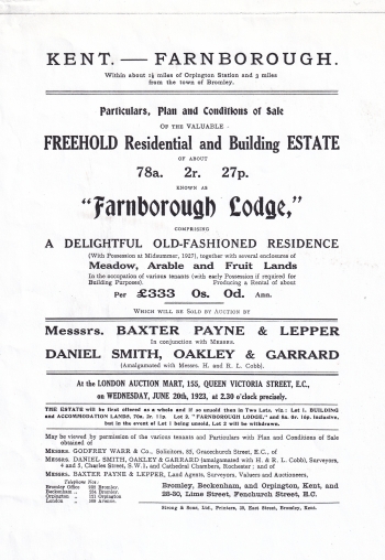 It was offered for rental in 1923, by Baxter Payne and Lepper, local estate agents who are still trading. Below is the offer announcement with the accompanying map showing the extensive grounds, now the Farnborough Park Estate. Click images to enlarge.