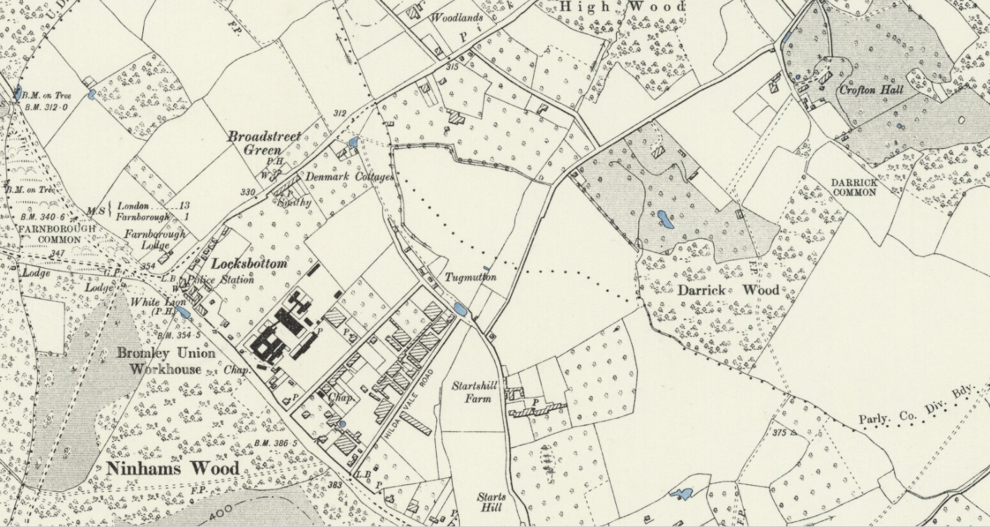 In the past the open land of Tugmutton or 'Leg Of Mutton' Common, a short distance from Farnborough at Locksbottom, was also where the Gypsies lived. The map above is an OS map dated 1895 and shows Tugmutton Common at the centre. Click to enlarge