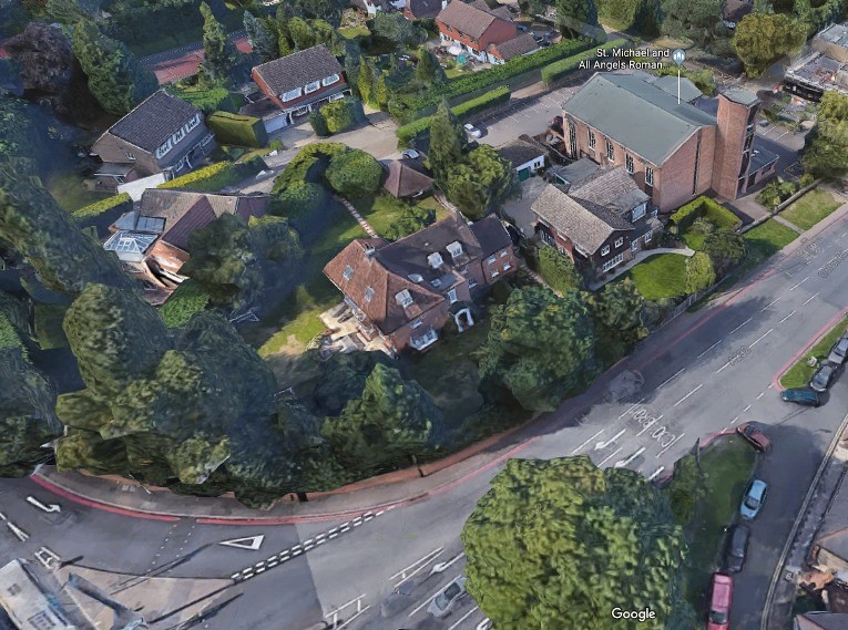 Farnborough Lodge today, surrounded by housing and the Roman Catholic church
