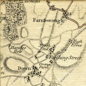 The route from Farnborough down to Green Street Green may have existed as a track before 1800, but it is not shown on the first map, and was clearly not suitable for heavy coach traffic. But by the beginning of the nineteenth century the naturally marshy ground in Green Street Green had been drained, enabling the road to be improved. As a consequence Green Street Green had started to expand from what had previously been little more than a hamlet, and the turnpike route was changed to use Farnborough Hill and run through Green Street Green.