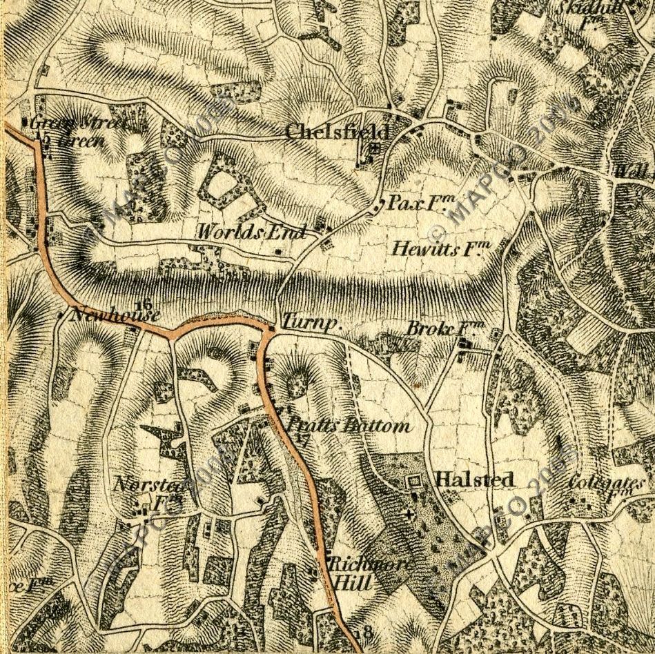 The first change was the diversion of the route after the George and Dragon to create the High Street and Farnborough Hill down to Green Street Green; and then continue through that village to rejoin the original route at the far end of Old Hill. This may also be when the High Road was renamed Church Road.