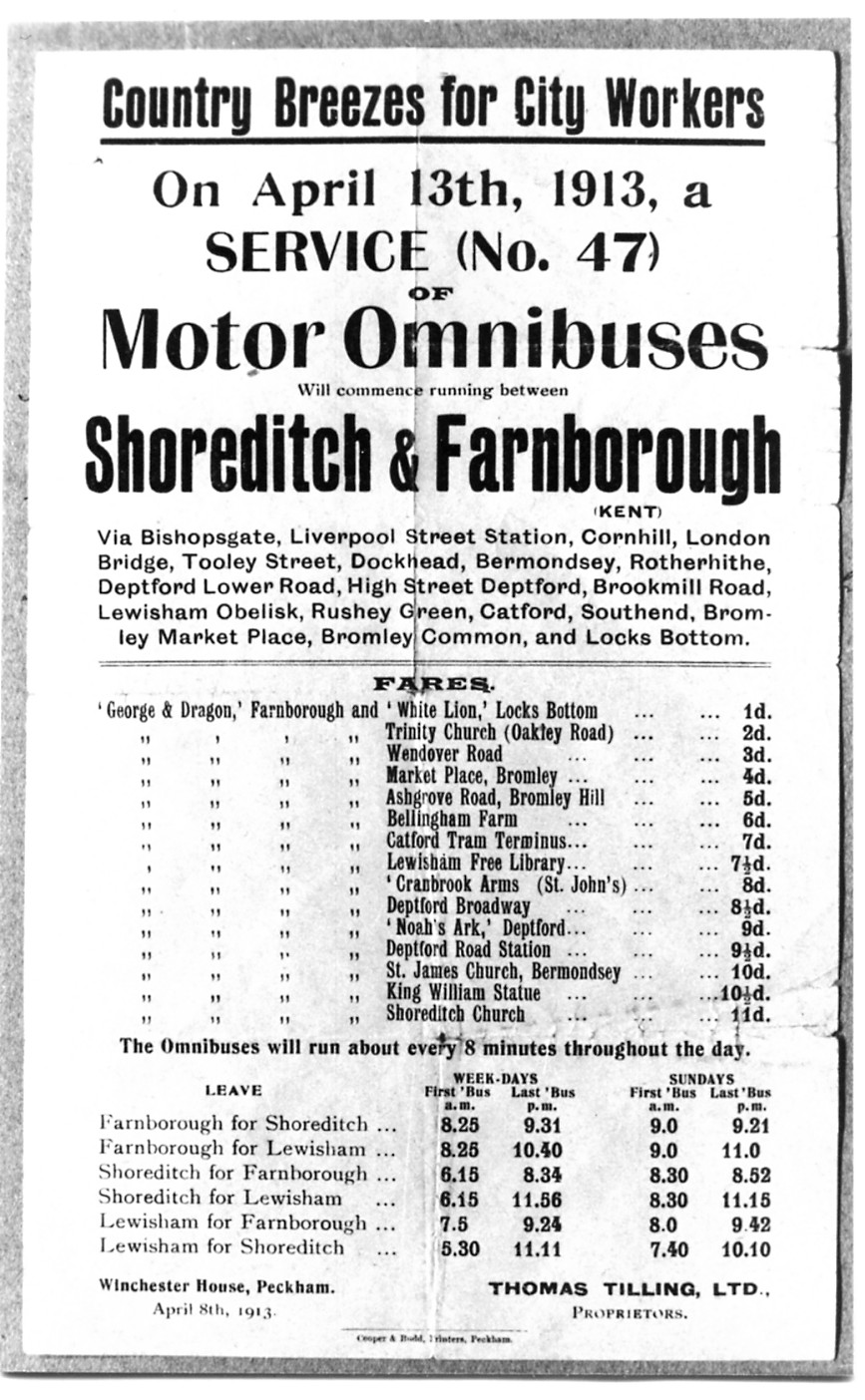 Thomas Tilling Ltd’s motor buses started operation on route 47 between Shoreditch and Bromley on 20 July 1912, replacing a horse bus route from ‘The City’ to Lewisham. Joint working with the London General Omnibus Company, London’s principal bus operator, began in 1908, and came to route 47, by then extended south to Farnborough in 1913.