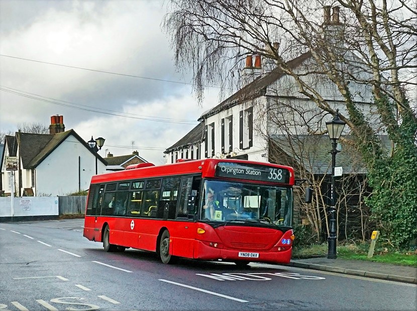 The only route through the village today is the 358 from Orpington via Farnborough, Bromley and Beckenham to Crystal Palace, see photo below. This started in 1992 replacing routes 261 and 361, providing a more frequent service through the village.